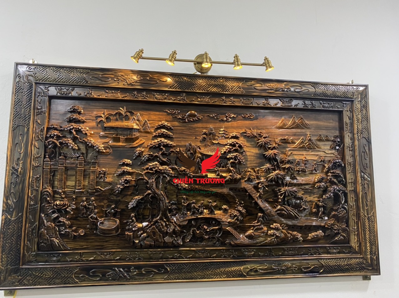 Trọn bộ nội thất trong phòng khách thì không thể thiếu những bức tranh tuyệt tác. Mỗi bức tranh được đặt để trong đó tình yêu với nghề, tình yêu với từng nhân vật trong tranh tạo nên những nét vẽ cực uyển chuyển và thu hút. Tranh được làm bằng gỗ mun vân hoa đẹp mắt.