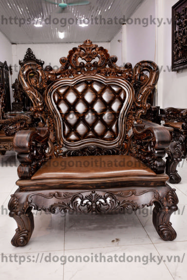 Siêu phẩm đầu tiên được lộ diện chính là bộ hoàng gia tân cổ điển. Trước mặt bạn là bộ bàn ghế với hoa văn chạm trổ cực kỳ tinh xảo. Mỗi chi tiết đều được các nghệ nhân đặt cả tình yêu của mình trong đó. Những linh vật, hoa lá đạt đến đỉnh cao của chạm khắc đồ gỗ khiến người xem bị hút hồn ngay từ cái nhìn đầu tiên. Bộ bàn ghế được thiết kế theo phong cách cổ điển của ngày xưa, với đầu nghê ngự trên đỉnh.
